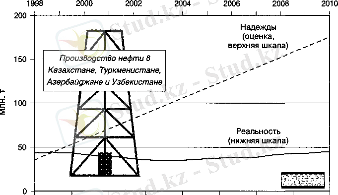 Таким образом, динамика реального производства энергоносителей резко от-личается от ее прогнозов начала 90-х годов. Несмотря на это на эти не оправдав-шиеся прогнозы продолжают ссылаться не только члены правительств прикас-пийских государств, но и аналитики международных организаций (см., например: IEA, 1998; EIA, 1998; OECD, 1998) . На рисунке 1 представлено сравнение этих «надежд» с «реальными возможностями» добычи каспийской нефти. В то время как большинство специалистов ожидали роста добычи нефти, последние данные свидетельствуют о том, что на самом деле добыча едва компенсировала спад, по-следовавший после распада СССР, и до сих пор остается на низком уровне: 48 млн. т нефти, добытые четырьмя прикаспийскими государствами в 1997 г., со-ставляют лишь 1/10 объема добычи нефти в Саудовской Аравии и лишь 1/3 ее добычи в Норвегии или Великобритании.