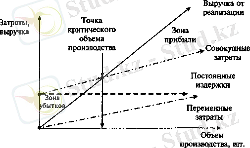 Три главные линии показывают зависимость переменных затрат, постоянных затрат и выручки от объема производства. Точка критического объема производства показывает объем производства, при котором величина выручки от реализации равна ее полной себестоимости.