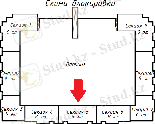В состав многоквартирного жилого комплекса входят 9 секции: шесть 9-этажных и три 8-этажных (секции 1, 2, 3, 4, 5, 6, 7, 8, 9) и одноэтажный встроенно-пристроенный паркинг. Разработан для строительства в 1В климатическом подрайоне (г. Астана, Республика Казахстан) . В данном жилом комплексе мной будет расмотрено секция №5.