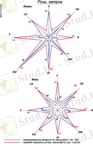 Для исследуемого района характерны частые ветры, дующие преимущественно в юго-западном направлении. Среднегодовая скорость ветра равна 5, 0-5, 6 м/сек. Розы ветров показаны на рисунке 2.