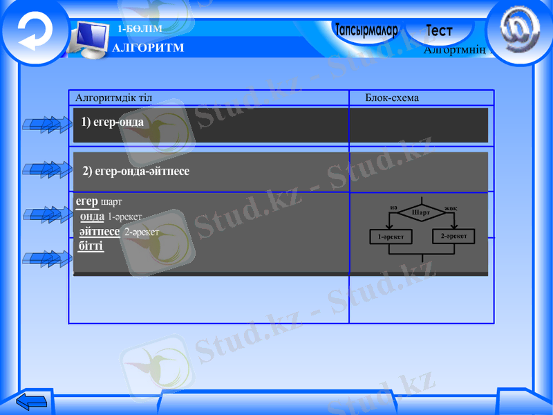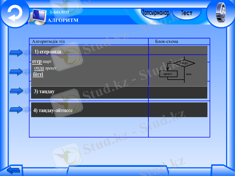 алгоритмде арифметикалық теңсіздік пен теңдік түрінде берілген логикалық шарт тексеріледі. Логикалық шарт тексеріледі, егер орындалса, онда 1 - жолмен, ал егер орындалмаса, онда 2-ші жолмен жүзеге асады да, соңында екі тармақ бірігеді. Мұндай алгоритмдерді шарт тексеру, яғни тармақталу алгоритмдері деп атаймыз. Блок схемасында шарт тексеру блогы - ромб қолданылады.