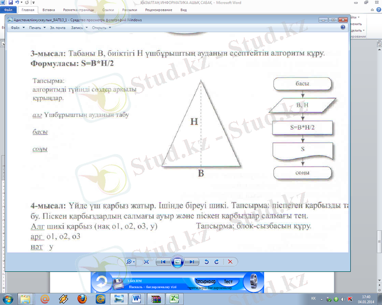 Көрсетілген блок-схемасы бойынша табаны В, биіктігі Н үшбұрыштың ауданын есептейтін алгоритмін және программасын құру. 10мин