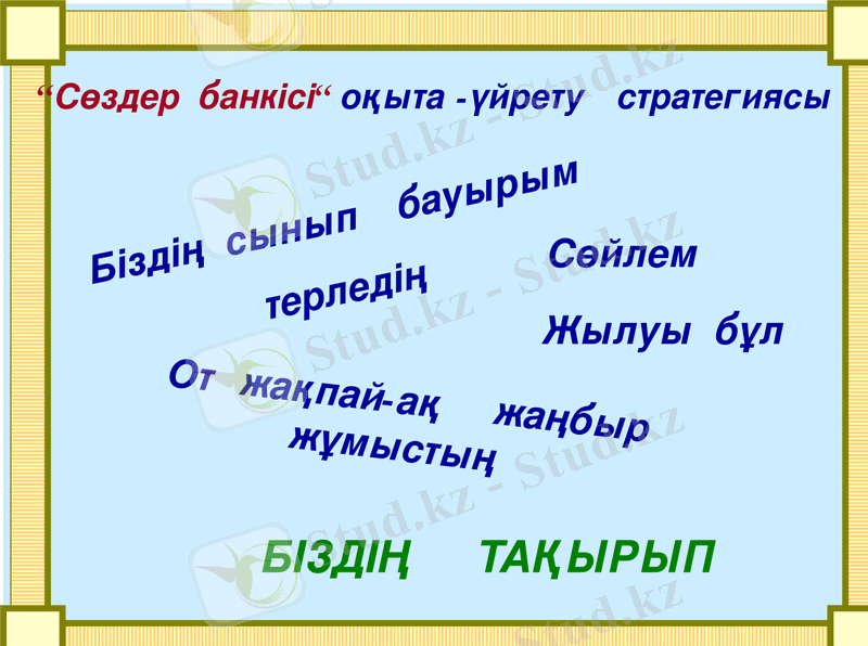 Стратегиялар : «Топтастыру», «Сөздер банкісі»-оқыта-үйрету, «Рефлексия»