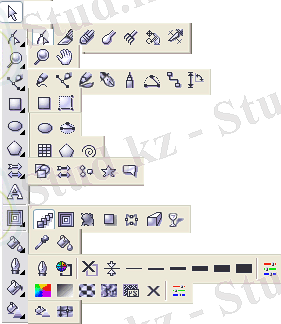 1-суретте Corel Draw бағдарламасындағы құрал-саймандар панелінің құрамына кіретін барлық қызметші құрал-саймандар бейнеленген. Мұнда негізгі блок панелі сол жағында, ал қосымшалары оң жағында тұрады.