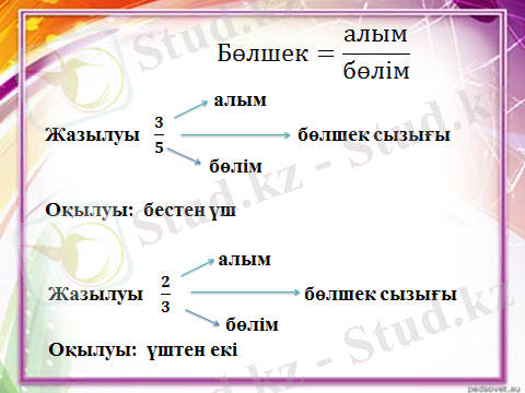 Жазылуы: , 2 - алым, 3 - бөлім, ортадағы сызық - бөлшек сызығы. Оқылуы: үштен екі.
