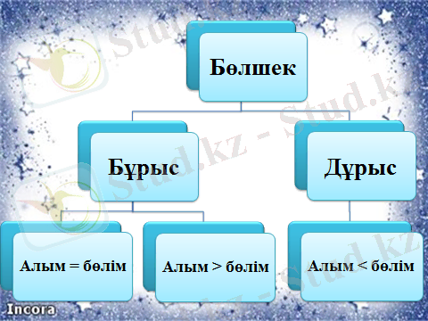 Бөлшекті дұрыс бөлшек және бұрыс бөлшек деп екіге бөлінеді.