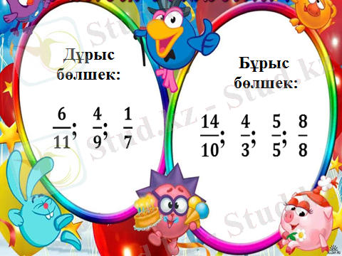 Алымы бөлімінен кіші бөлшек дұрыс бөлшек деп, алымы бөлімінен үлкен немесе алымы бөліміне тең бөлшек бұрыс бөлшек деп аталады.