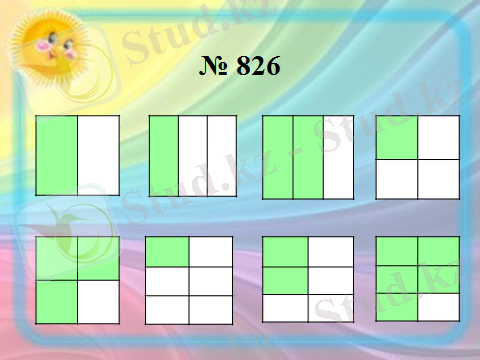 Квадраттың неше тең бөлікке бөлінгенін және оның қандай бөлігі боялғаныын анықтаңдар. Бөлшек түрінде жазып, оның алымы мен бөлімін атаңдар. Квадраттың қандай бөлігі боялмаған?