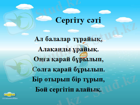 Ал қазір, шамалы демалып алайық. Сергіту сәтін бастайық. Барлығымыз орнымыздан тұрамыз.