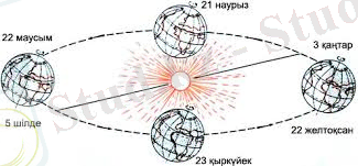 Жердің орбитадағы орнына байланысты жыл мезгілдерінің ауысуы.
