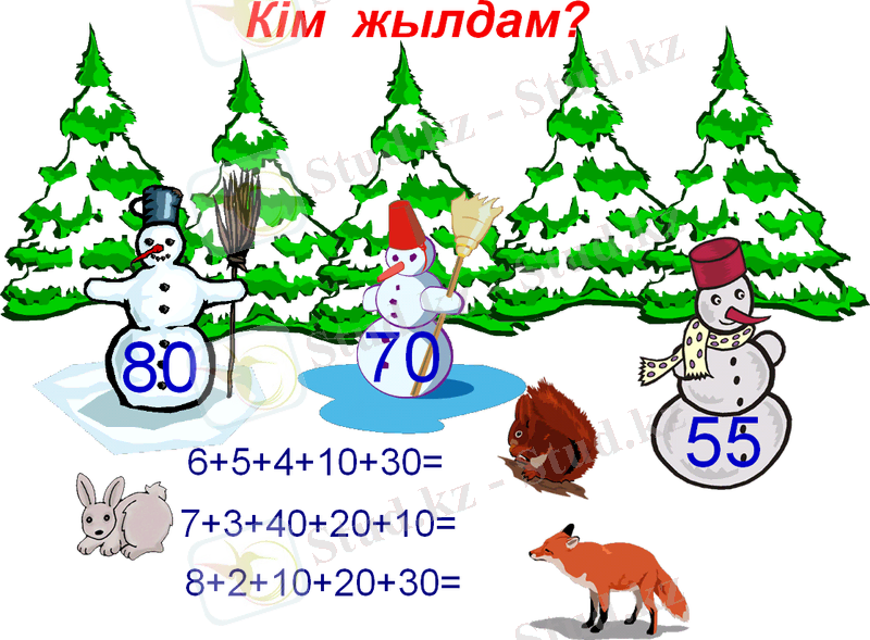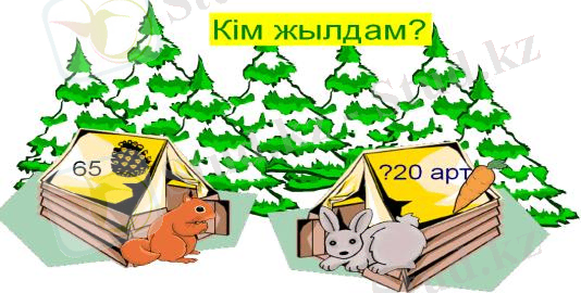 Тиін үлкен-үлкен жаңғақтардан 65 жинаған, ал қоян одан 20 сәбіз артық жинағанын айтады. Қоян қанша сәбіз жинаған?Барлығы қанша азық жинаған?