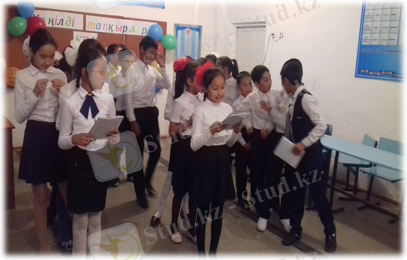 I жүргізуші: Ортаға біздің сыныптың тапқыр ұл-қыздарын шақырамыз. (музыка ырғағымен ортаға топтар біртіндеп шығады)
