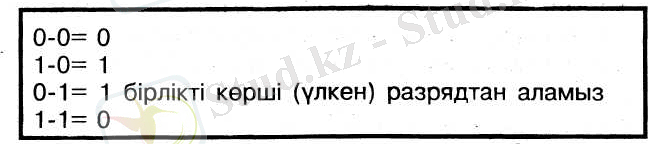 - Кіші разряд үшін 0-1 бар. Сондықтан үлкен разрядтанбірлікті аламыз және 10-1=1-ді табамыз.