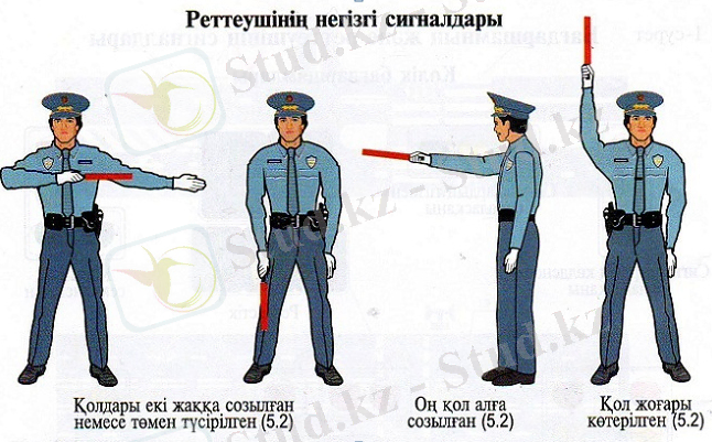 3-оқушы : -Көшеде автокөлік жүрісіне және жаяулардың өтуіне бақылау жасап, жол тәртібін реттеп отыру үшін жол полициясы қызметкерінің арнайы көмегі қажет. Реттеушінің негізгі жұмыс құралы - алатаяқ (жезл) пен ысқырық. Алатаяқ автокөлікті тоқтатуға белгі беру үшін керек. Ал ысқырық кейбір жүргізушілер белгіні байқамай қалған жағдайда, дыбысты естірту үшін қолданылады. Реттеуші қолындағы ала таяқпен көше қилысында автокөліктердің, жаяу жүргіншілердің өту кезегін реттейді.