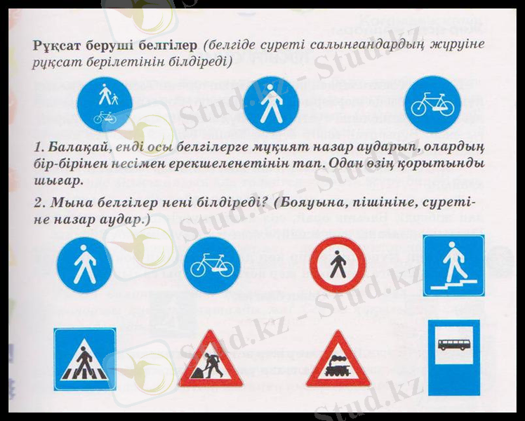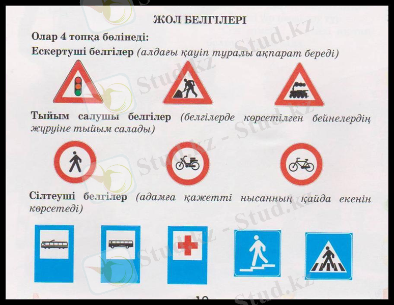 - Енді балалар, жол белгілеріне тоқталайық. Жол белгілері екі түспен беріледі. Қызыл түс қауіп туралы, ал көк түс рұқсат етілетінін білдіретінінжадыңда сақта! Жол белгілері бірнеше топтарға бөлінеді, біз соның төрт тобын білеміз, қане атап өтейік.