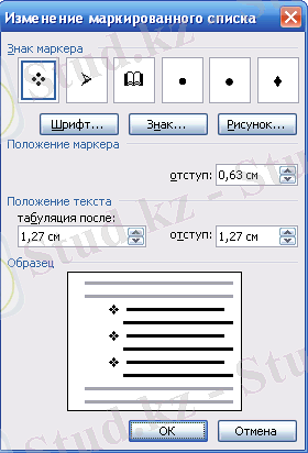 Маркерленген тізім батырмасының төмен жазылатын мәзірінде тізім үшін қажетті, өздеріңе қатты ұнайтын маркер түрін таңдауға болады. Өз тізімдеріңді құруға болады. .