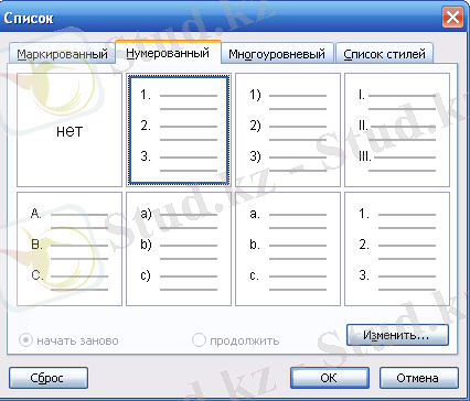 - Список диалог терезесінен маркерлердің немесе нөмірлердің варианттарын таңдап, Ок батырмасын шерту;