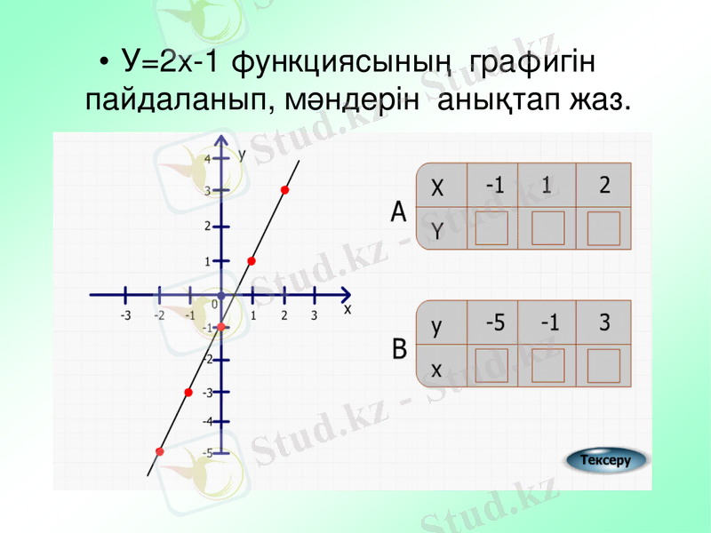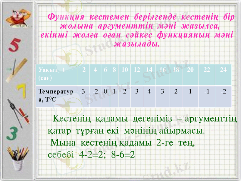 1) кестелік тәсілдің ерекшелігі- аргументтің мәндеріне сәйкес.