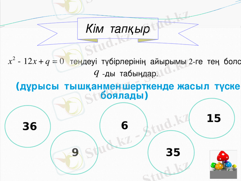 теңдеу түбірлерінің айырымы 2-ге тең болса, q -ды табыңдар. Дұрыс жауабын тапсаңыз шеңберді тышқанмен шерткенде жасыл түске боялады.
