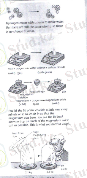 Оқулықтан химиялық реакцияның теңдеуінің анықтамасын, химиялық реакция теңдеуін жазудың ережесін, зат массасының сақталу заңының анықтамасын тауып, мәтіннен алған ақпаратты игеру