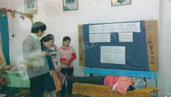 Көрнекілігі: Тақырып, цитата сөздер жазылған плакаттар, жасыл жапқыш, екі жасыл орындық, жарнама бұрышы, "Жасыл дәріхана" бұрышы, жеміс - жидектер, өсімдік түрлері, емдік қасиеті бар табиғи заттар.