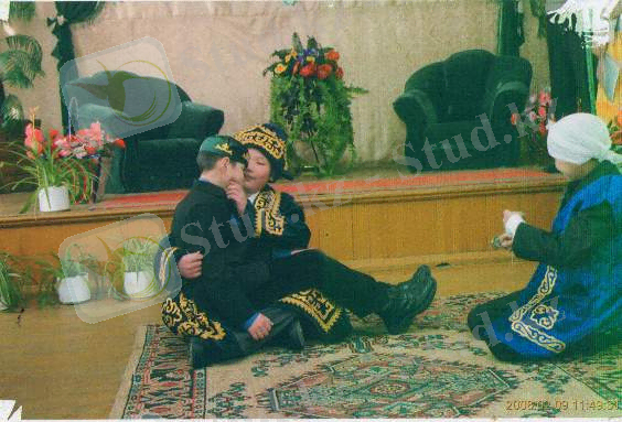 Немересі атасының алдында отырады. Әжесі қасында ұршық иіріп отырады.