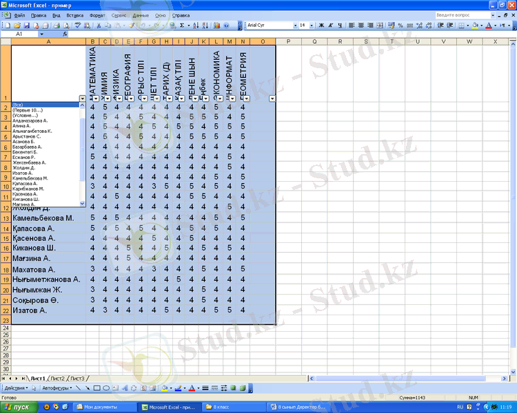 Деректер, Фильтр (Данные фильтр) командасын орындау арқылы қажетті жазбаларды басқалардан бөліп алуға, ерекшелеп теріп алуға болады. Ерекшелеп теріп алуды автоматты түрде Автофильтр командасының, ал жай әрекеттер арқылы Кеңейтілген фильтр (расширенный фильтр) командасының көмегімен орындауға болады. Әр оқушының жұмыс нәтижесін ауызша тыңдау.