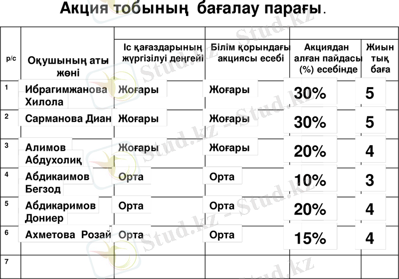 Мұғалім оқушылардың сабаққа қатысуын назарға алып, топ басшыларының бағалау парақтары арқылы формативті бағалаудан жиынтық баға шығарады.