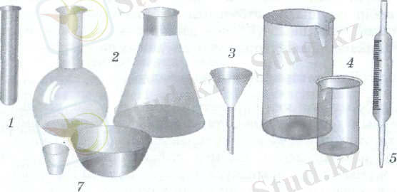 Лабораториялық ыдыстар: 1 - сынауык, 2 - кұтылар, 3 - қүйгы, 4 - стақандар, 5 - тамшуыр, 6 - склянка, 7 - отбакыраш