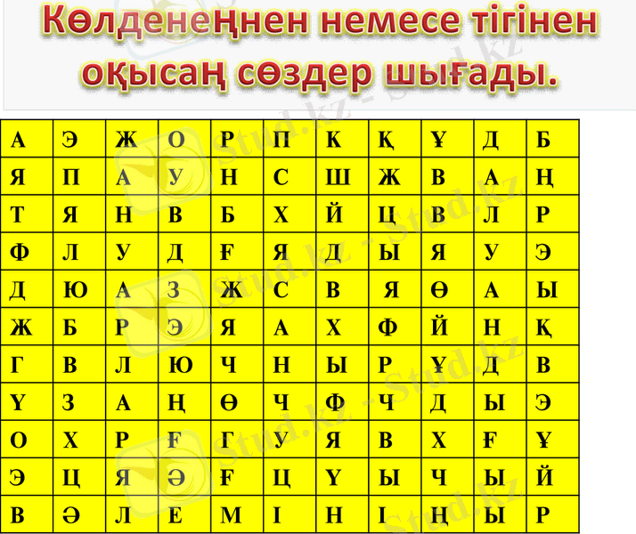 Мына жерде әріптер орналасқан сіздер осы көп әріптің ішінен көленеңнен және тігінен сөздер шығады. Кәне кім алғыр, кім жылдам екенін байқап