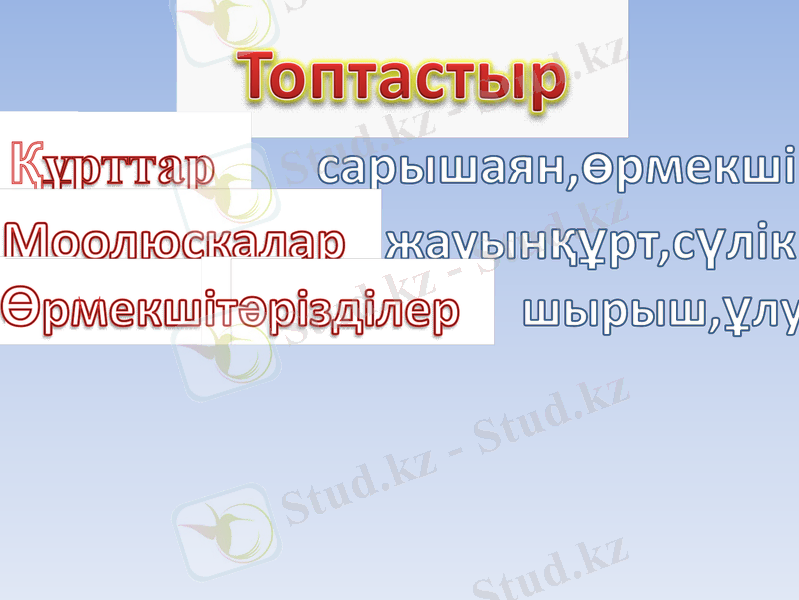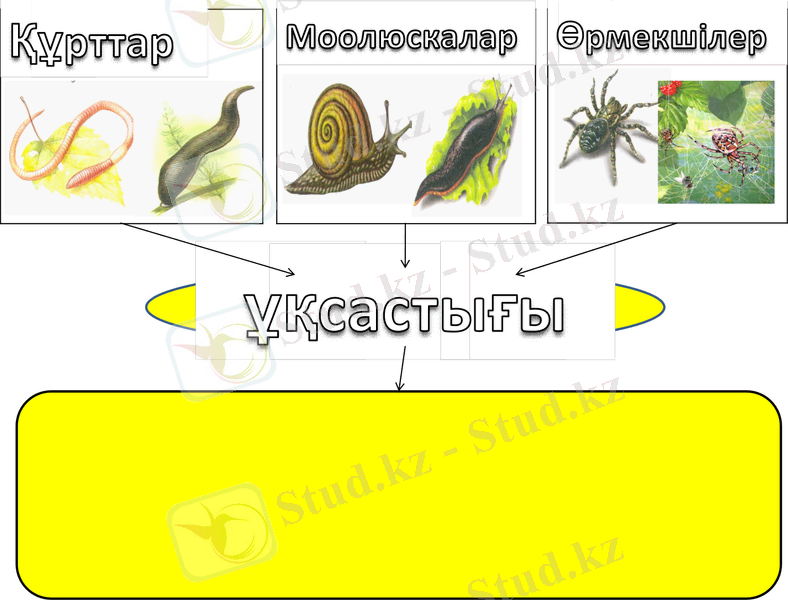 Балалар сіздер бағанадан құрттар, моолюскалар, өрмекшітәрізділер жайында айтып жатырмыз. Енді осылардың ұқсастығын тауып жіберейік.