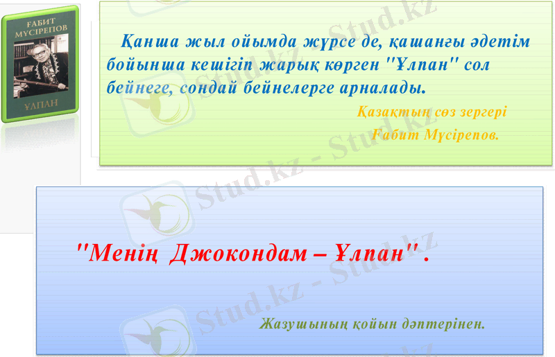 "Менің Джокондам - Ұлпан". Жазушының қойын дәптеріндегі осы бір сөйлемнен нені ұғамыз. Джоконда кім? Ол туралы не білеміз? Ұлпанды жазушы неге осы бейнеге теңестірді? Сіз кімгі ұқсатар едіңіз? Осы сөздердің мағынасын ашып, оқушылар ойын білу.