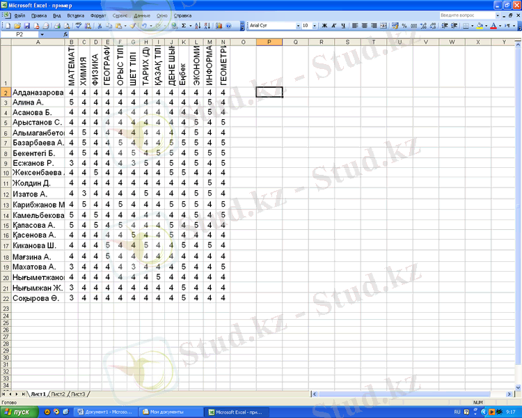 - «Алгебра», «Химия», «Физика», «География», Орыс тілі», «Шет тілі», «Информатика», «Геометрия», ұяшықтарына сандық формат қойыңыз.