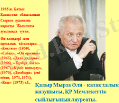 Қадыр Мырза Әлидің портретін көрсетіп, шағын мағұлмат беріп жазушының өлеңімен таныстыру.