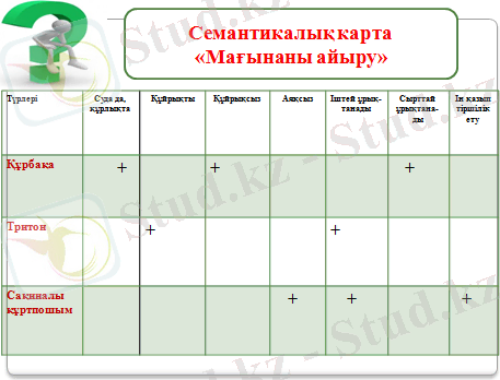 Тәрбиелік : Еліміздің әрбір тіршілік иелеріне келешек ұрпағымыздың оң көзқараспен қарауына ықпал жасай отырып, сирек кездесетін қосмекенділерді танытып, оларды қорғауға тәрбиелеу. Сабақ типі: Аралас сабақ Сабақ түрі: Дәстүрлі Сабақтың әдіс-тәсілі: ойын, сұрақ- жауап, үлестірме материалдармен жұмыс, кесте, тірек - сызбалармен жұмыс, семантикалық карта