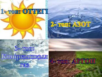 - «Жер», «Су», «Топырақ», «Күн» суреттерін таңдаңдар. Бұлар бізді қоршап тұрған. Адам өміріндегі тіршілік көздері болып табылады. Сендер суреттерге байланысты топтарға бөлініп отырыңдар.