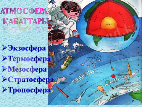 - Жер шары көзге көрінбейтін мөлдір жабынды- ауамен жабылған. Жел- ауаның қозғалысы. Атмосфера деп- біздің ғаламшарымызды және бізді қоршап тұрған ауа қабатын айтамыз. Жердің ауа қабығын көбінесе бесінші мұхит деп атайды. Біз газдан тұратын ауа мұхитының түбінде тұрамыз.