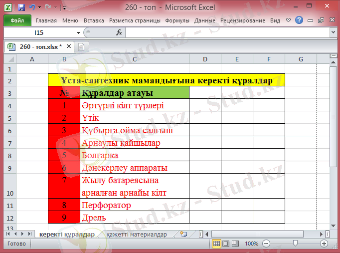 Өзіміз жұмыс жасап отырған («260 - топ») жұмыс кітабын 2 жұмыс парағын қамтитын етіп алайық. 1-жұмыс парағының атын «керекті құралдар», 2-жұмыс парағының атын «қажетті материалдар» деп жазайық.