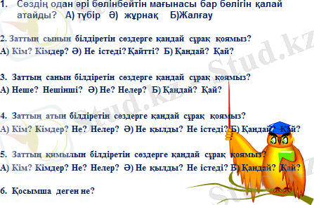 Мақсаты: 1. Оқушылардың заттың аты туралы алған білімдерін кеңейте отырып, осы сөздердің атауын негіздеуге, зат есімдерді тауып, оларға тиісті сұрақ қоя білуге дағдыландыру;