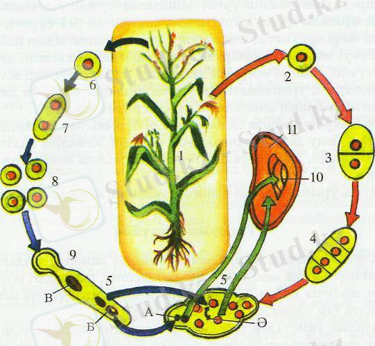- Жабык тұкымды өсімдіктердің косарланып ұрыктануы: 1 - тұқым бүршігі бар жүгері собығы; 2 - ұрық қапшығының аналық жасушасы; 3, 4 - мейоз нөтижесінде төрт гаплоидті жасушаның тұзілуі; 5 - ұрық қапшығы; А - ұрықтанғаннан кейін ұрық түзетін жұмыртқа жасушасы; Ә - қосылатын екі жасуша; бұлардың ұрықтануынан триплоидті эндосперм түзіледі; 6 - тозаңның аналық жасушасы; 7, 8 - мейоз нәтижесінде төрт гаплоидті тозаңды түйіршіктердің түзілуі; 9 - тозаң түтігі: Б - екі спермий;