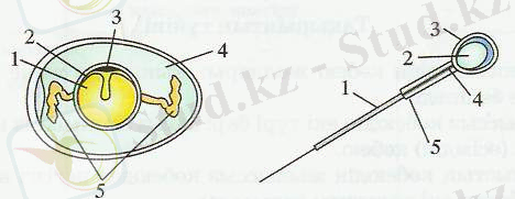 1 - сарыуыз; 2 - сарыуыз қабықшасы; 3 - ұрық табақшасы; 4 - нәруыз; 5 - жұмыртқа жасушасын жұмыртқа орталығына орныктырып тұрған арқаншалар