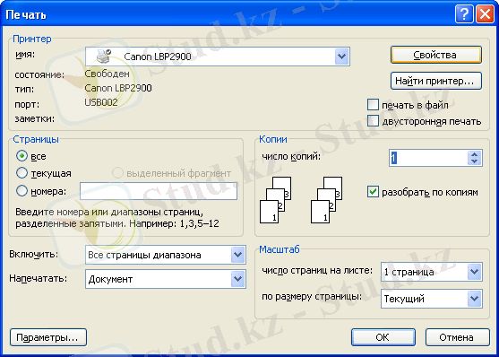 - Страницы бөлімінде құжаттың қай бөлігі баспаға берілетіндігі тағайындалады. Бүкіл құжат үшін - все белгіленген бөлік үшін Выделенный фрагмент, ағымдағы бет үшін -Текущая, нөмірлері бойынша - Номера бөлімдерін таңдау қажет.