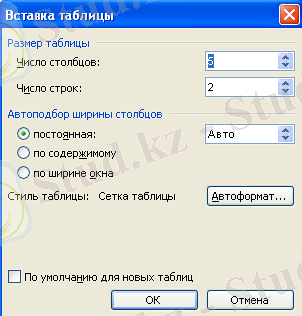 1. Таблица -Добавить - Таблицу командасын таңдау керек. Вставка таблицы диалогтық терезесіндагі Число столбцов бөлімінде кестедегі бағандар санын, ал Число строк бөлімінде қатарлар санын тағайындау қажет.
