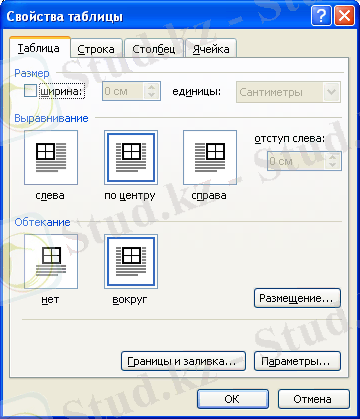 ұяшықтары мен бағандарының қиялысқан жеріне мауысты белгілеп жылжыту қажет. Содан кейін Таблица - Свойства командасын таңдау қажет