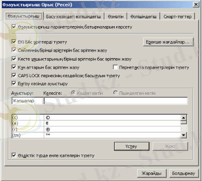 - Өзауыстырғыш. Бұл әмір жиі кездесетін қателерді ( қате терілген сөздерді ) өздіктік түзетуге арналған. Microsoft Word - та осы сөздердің тізімі және оларды дұрыс сөздерге ауыстыру нұсқалары бар. Тізімге жаңа элемент үстеу параметрлеріәмірін орындау қажет, осының терезесі ашылады.