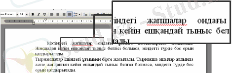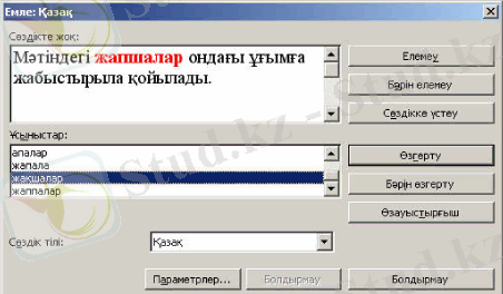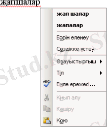 Сөздегі немесе сөйлемдегі қатені түзету үшін оны тінтуірдің оң жақ пернесімен шертуі қажет, сонда қатені түзету нұсқалары ұсынылатын мәтінмәндік мәзір қалқып шығады.