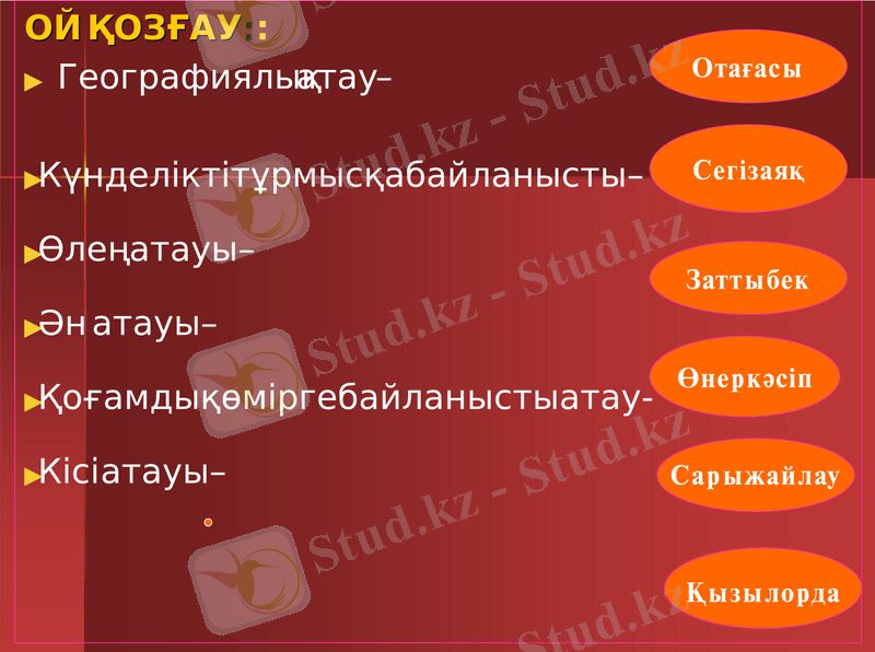 - Мемлекет, республика, облыс, аудан, қала, ауыл атаулары: Азия, Қазақстан, Қарағанды, Қазыбек би, Жезқазған, Ақтоғай;