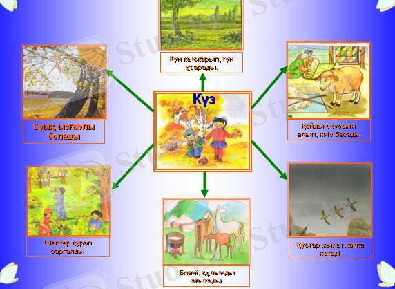 Абайдың «Күз» туралы өлең жолдарымен сабағымды ашып, бір оқушыға мәнерлеп оқытамын. Осы өлең жолдары арқылы күздегі табиғаттағы өзгерістер, жан- жануарлардың, құстардың күзгі тіршілігі туралы оқушылардан сұрай отырып, берген жауаптарын бір арнаға топтастырамын.