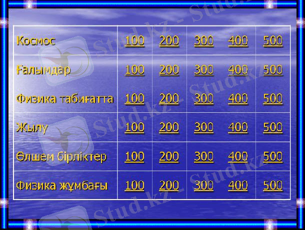 - Біліміңді тексер (100-500 балға дейін берілген сұрақтарға жауап беріп, қандай деңгейлі балл алса сонша балдық жүйемен бағаланады. Ойлануға 15 секунд)