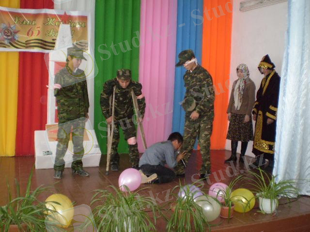 Көрнекілігі: Ұлы Отан соғысына қатысқан батырлардың портреттері, нақыл сөздер жазылған плакаттар, «Мәңгі от» макеті.